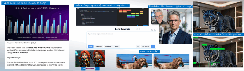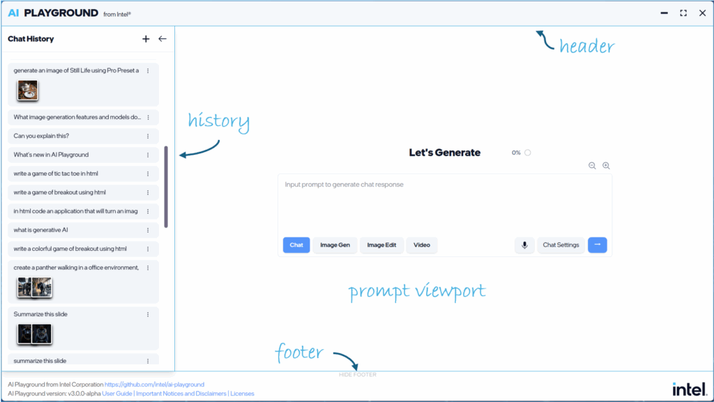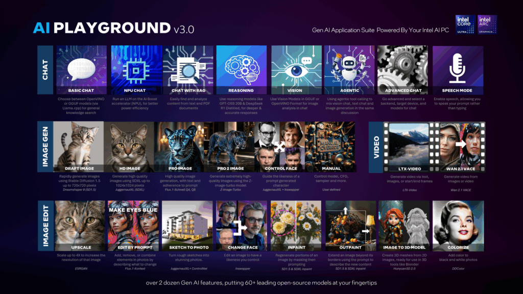 AI Playground beta is a free to download and app for doing Gen AI inferencing on your Intel Core Ultra or Intel Arc GPU based systems. AI Playground curates over 60 top open-source models and ties them to a variety of point and click features for chat, image generation, image generation and video.