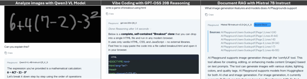 - Llama.CPP: For access to latest models in GGUF format, AI Playground provides models such as Qwen 3VL, DeepSeek R1 Distilled, and GPT-OSS 20B in GGUF format, for use in the chat mode
