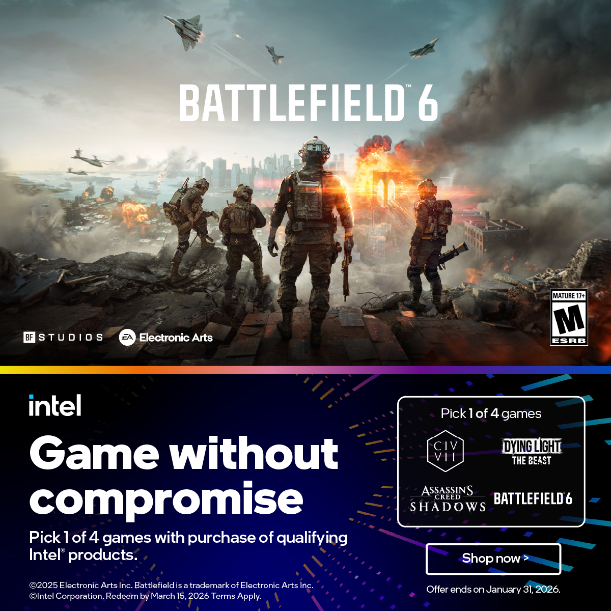 Good things may come in small packages, but we believe that great things come in bundles. Whether you celebrate the holiday season or not, the 2025 holiday bundle offer is there for you. With each qualifying Intel purchase, you get to pick one of four blockbuster titles that have each made big waves this year—choose from the pulse-pounding  Battlefield™ 6, the nerve-shredding zombiefest Dying Light: The Beast, the acrobatic epic Assassin’s Creed® Shadows, or the latest consuming stage of construction in the legendary strategy game franchise, Sid Meier’s Civilization® VII. Want a taste of what you have to look forward to? Unwrap some Battlefield 6 action here.